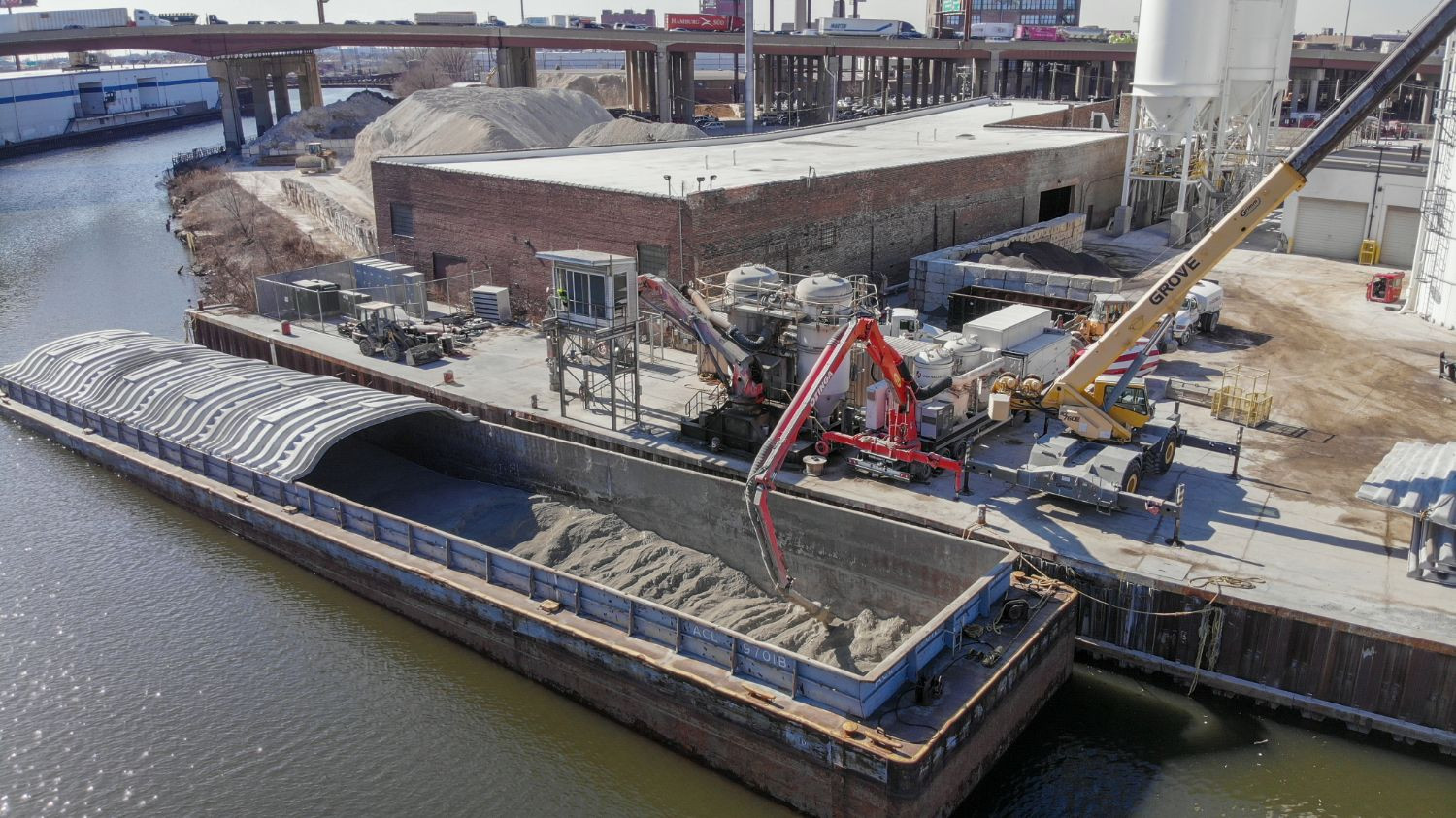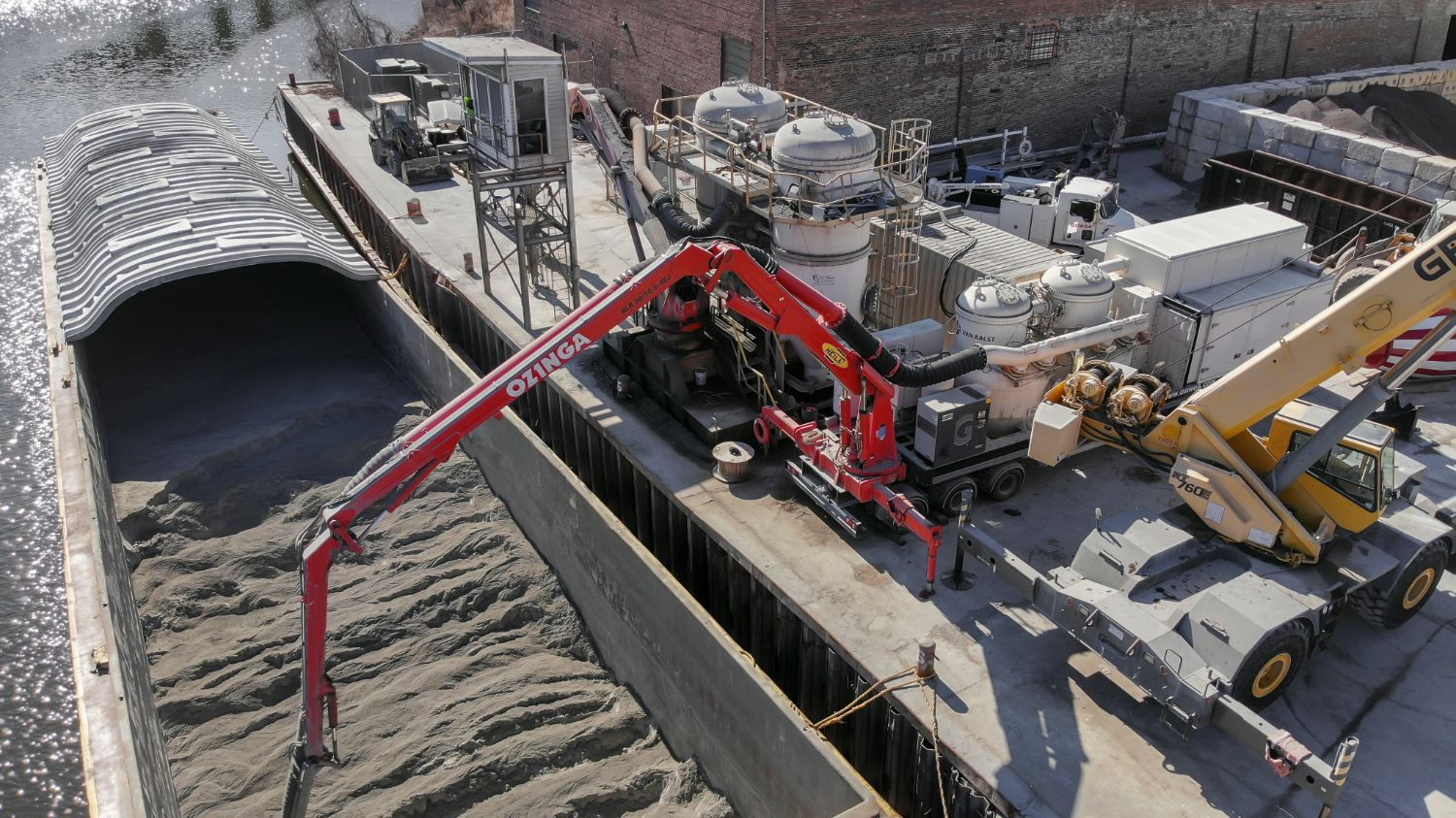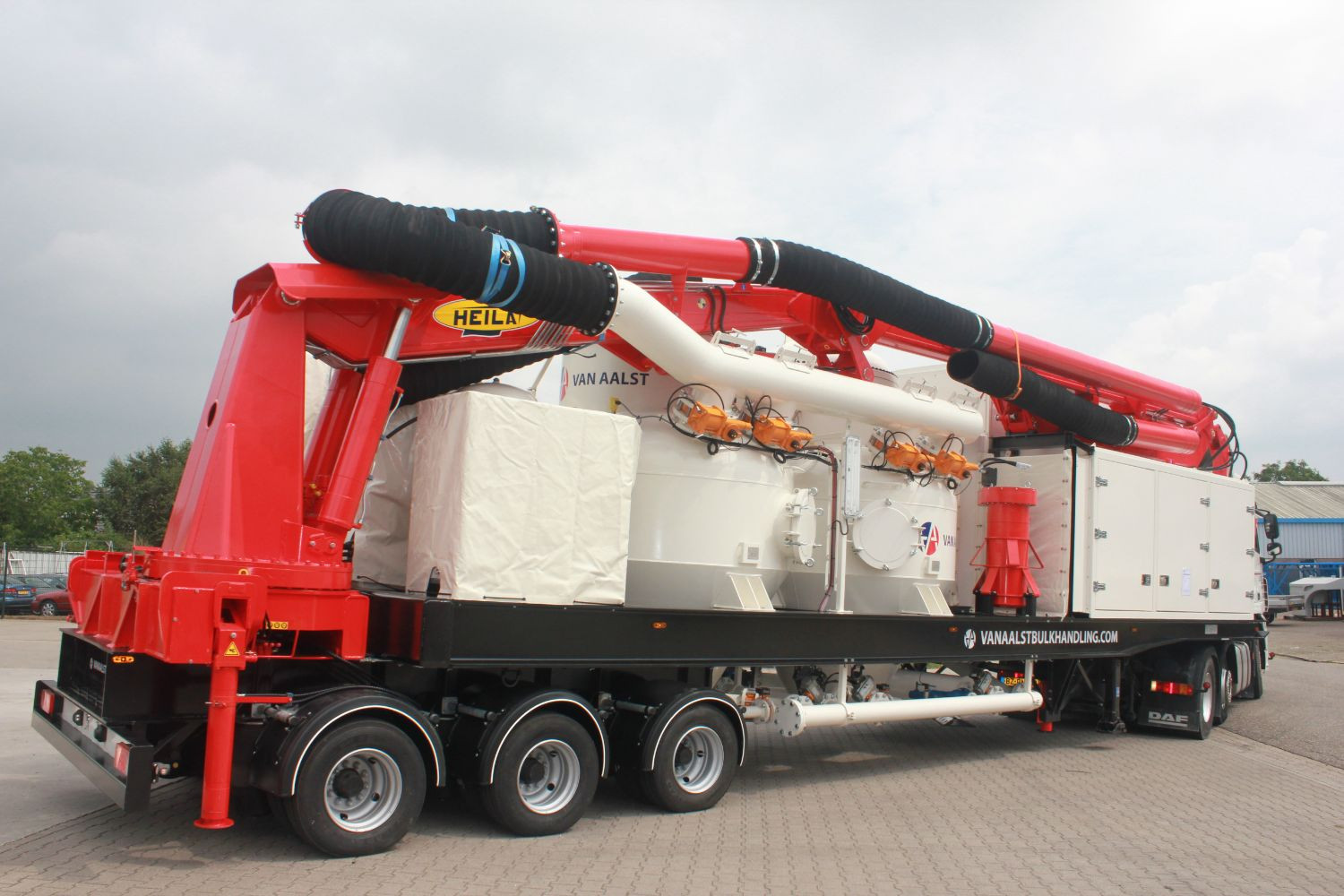 This road mobile ship unoader has a compact structure which allows it to be transported by road between ports in Chicago, with hardly any disassembly work. Hook-up and temporary dismantling of the suction arm (for road transport) can be performed by the unit itself, without the need for any assistance in the various ports. All disassembled arm sections can be stored on the trailer during transport. For pulling the machine, either normal road trucks or a combination of dolly and front-end loader can be used, depending on the situation.