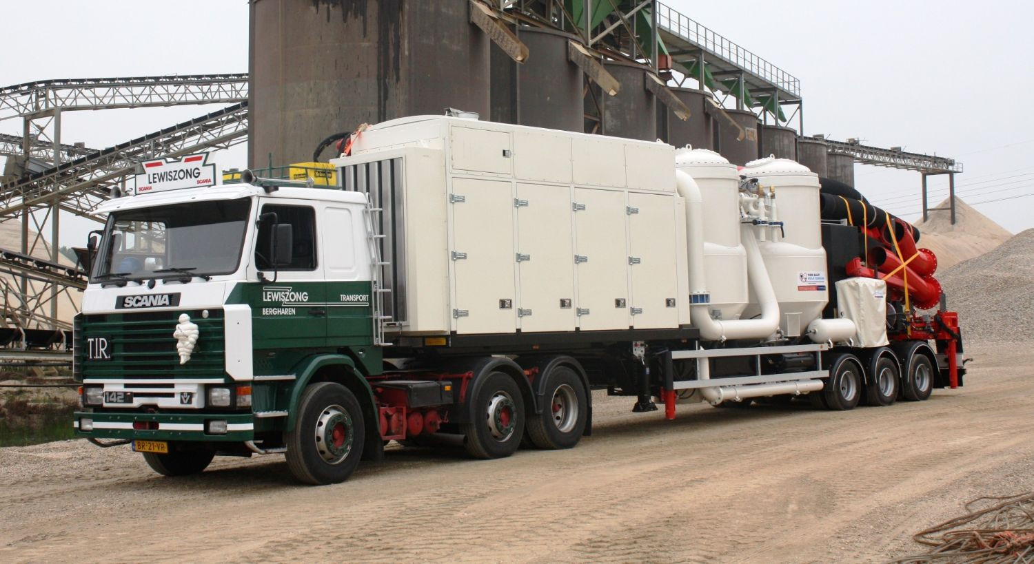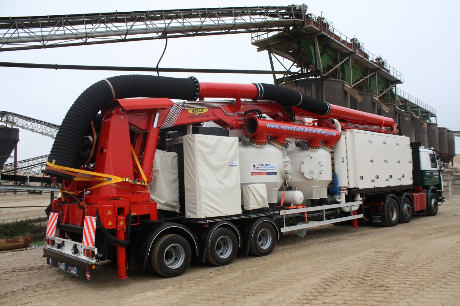 The pneumatic ship unloader for cement by Van Aalst Bulk Handling performs 2 jobs at the same time; unloading of the ship and conveying of the unloaded cement to a silo or storage facility. These two systems are integrated together on 1 road-legal trailer, that can travel throughout Europe without the need for special permits (see technical characteristics below).