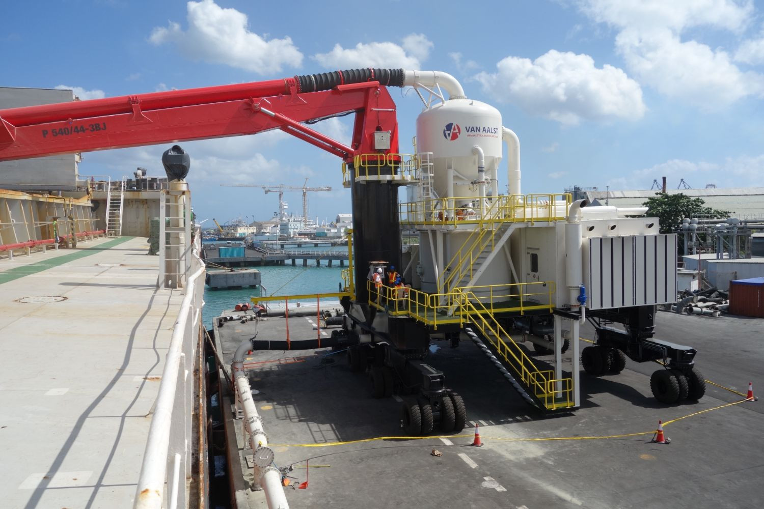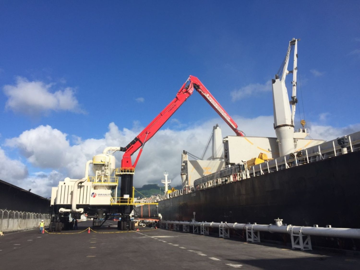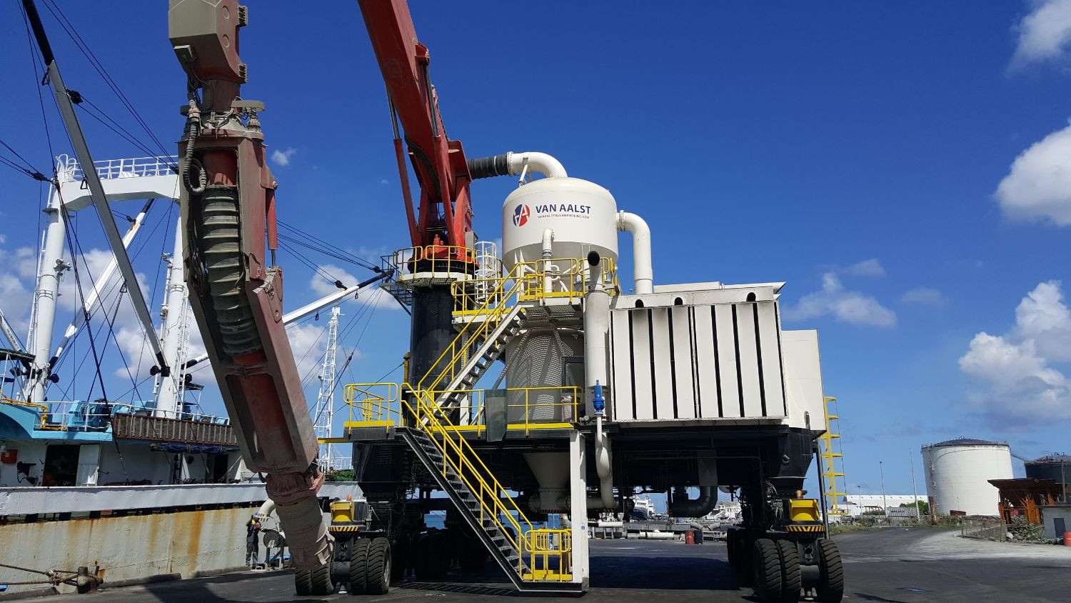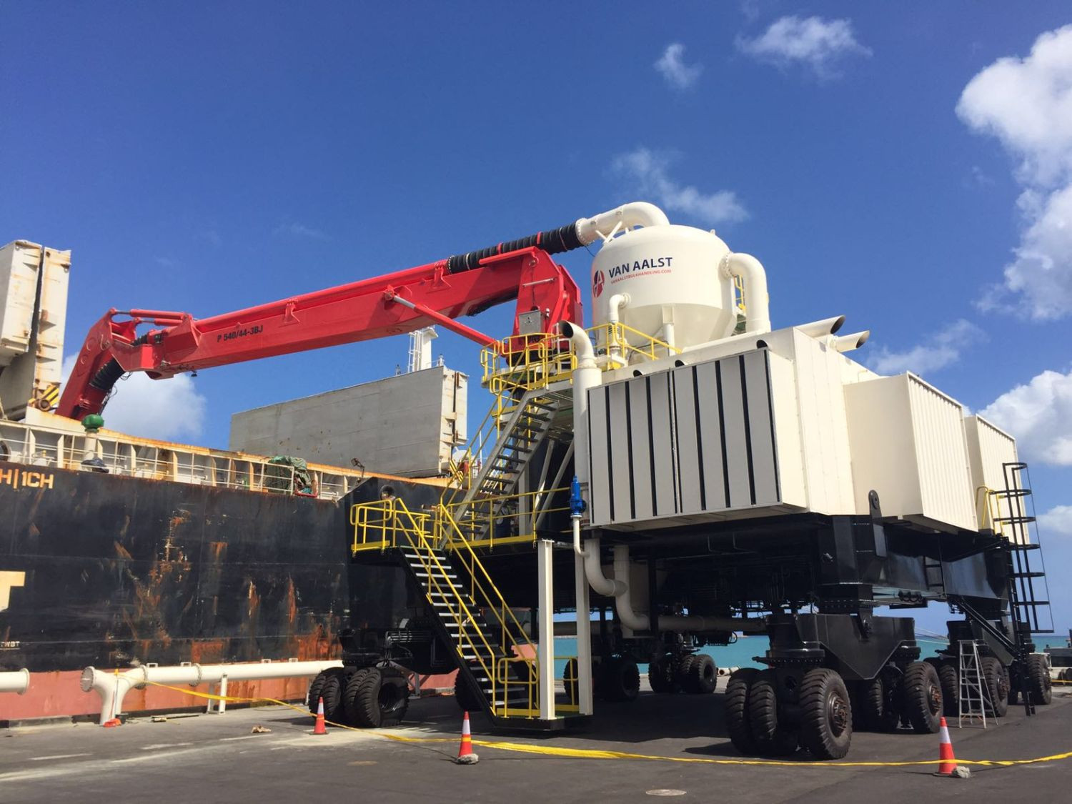 This ship unloader has an unloading capacity of 450 tph with a conveying distance up to 300 meter and is capable of unloading ships up to 60.000 dwt. The cement manipulator on this machine is 44 meter long. The machine is self-propelled, is removable from the quay and is flexible and easy to park. In whole a very important machine for the total construction market in Mauritius.