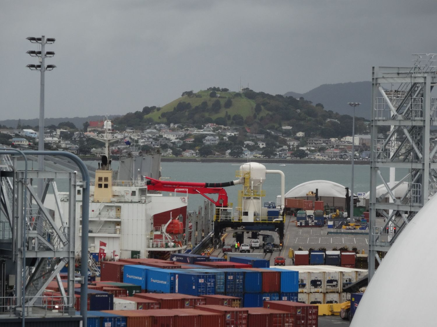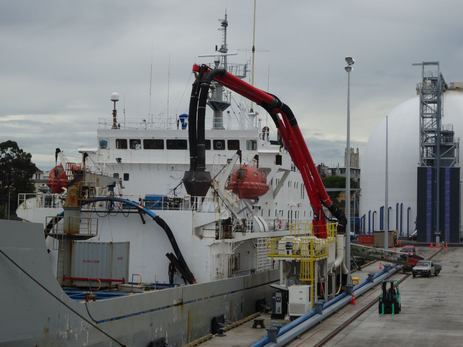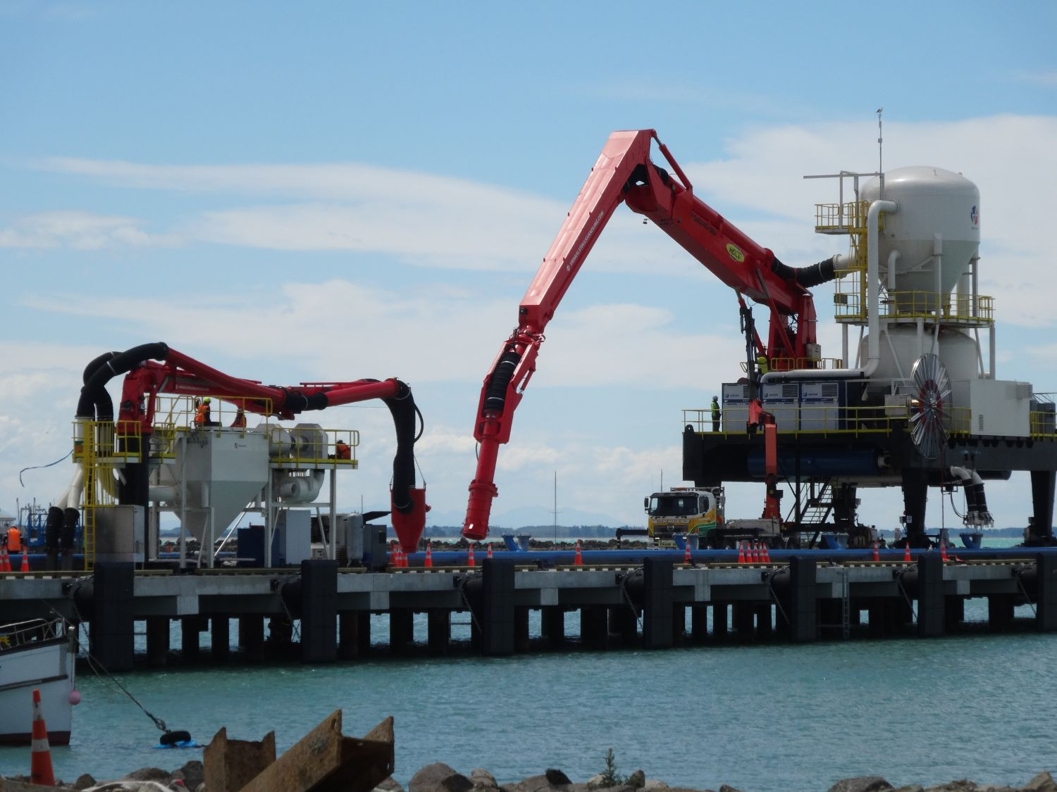 The machines arrived in New Zealand mid November 2015. First the equipment for the cement terminal in Timaru were installed. The ship loading equipment for Timaru is designed to load cement from silo’s into seagoing ships with a maximum size of 15.000 dwt. The loading head, which is placed on the deck by the loading arm, drops the cement from the loading arm into the ship via a hole in the hatch.